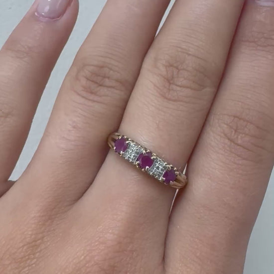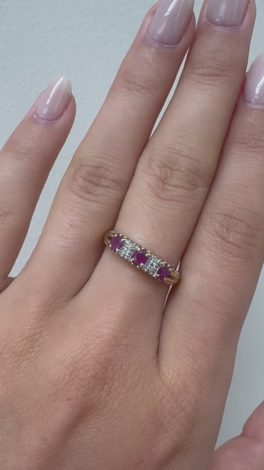 Wunderschöner Ring aus 9ct Gelbgold, besetzt mit drei runden Rubinen, die jeweils von Paaren funkelnder Diamanten flankiert werden.