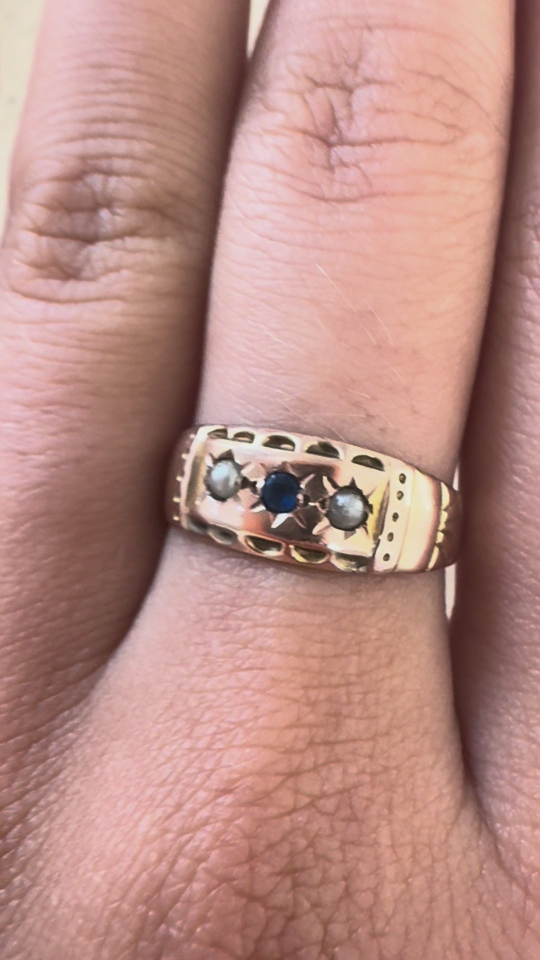 Ein zarter Schatz aus vergangenen Zeiten: Dieser antike Ring aus dem Jahr 1906 wurde aus 9kt Gelbgold gefertigt und trägt einen facettierten, runden Saphir im Zentrum, eingerahmt von zwei kleinen Saatperlen. Alle drei Steine sind in einer fein gravierten Sternfassung im typischen Gypsy-Stil eingebettet – ein Design, das für seine schlichte Eleganz und zeitlose Ausstrahlung geschätzt wird.