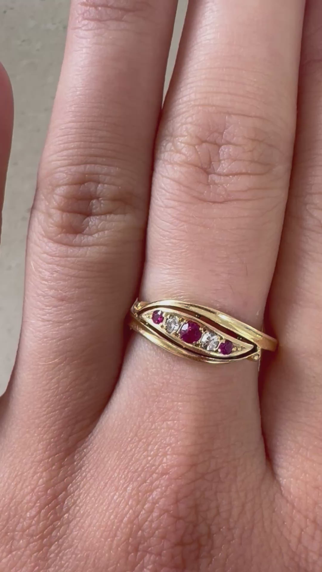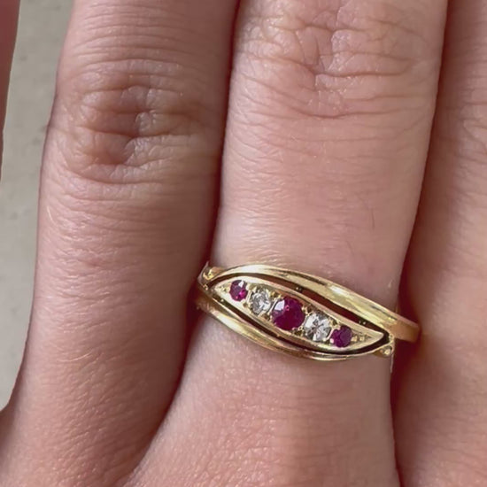 Ein eleganter Schatz gefertigt im Jahr 1920 in Birmingham aus 18kt Gelbgold und besetzt mit drei leuchtend roten Rubinen und zwei funkelnden Diamanten. Die Steine sind in einer markanten Navette-Form gefasst, die den Ring zu einem echten Blickfang macht.