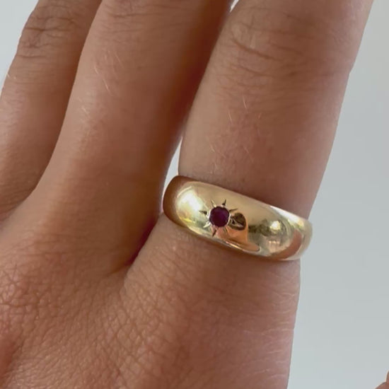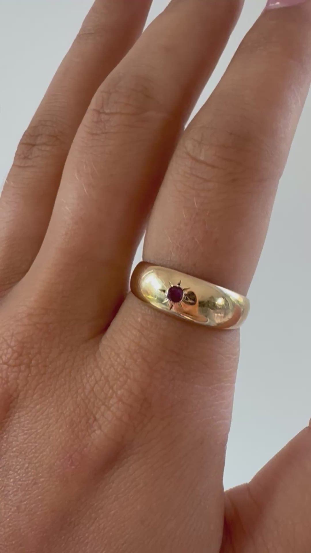 Ein edwardianischer Gypsy-Ring aus massivem 18kt Gelbgold, gefertigt 1905 in Birmingham. Im Zentrum funkelt ein alter Rubin im Sternenschliff – ein klassisches Detail, das Gypsy-Ringe so zeitlos macht. Die sanft gewölbte Ringschiene verleiht dem Stück seinen markanten Charakter und hohen Tragekomfort.