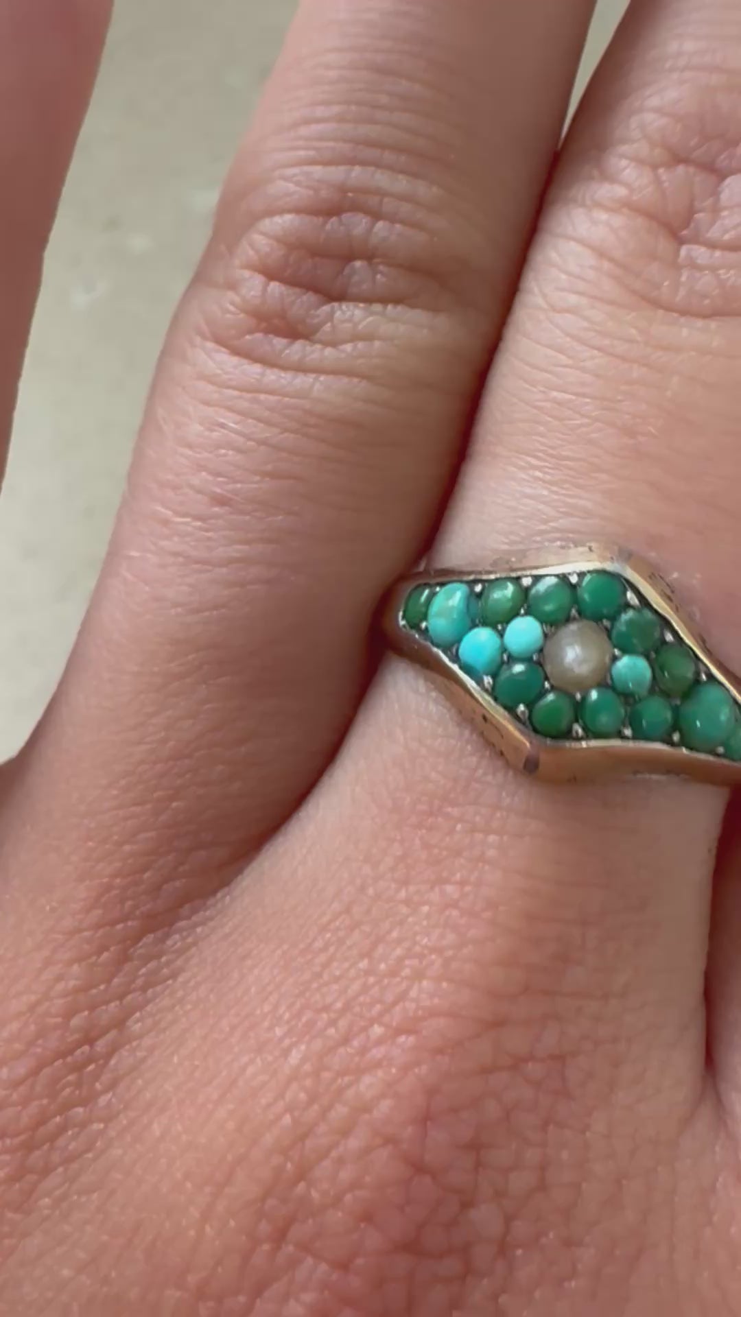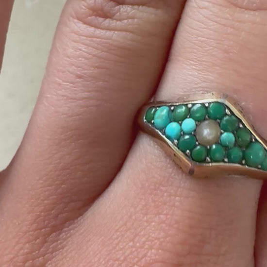 Antiker 9kt Gold Ring mit Türkis-Cluster & Saatperle