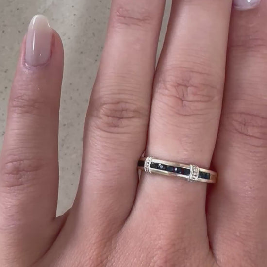 Ein seltener Fund aus Chester: Dieser antike 9kt Goldring (gestempelt) wurde vor 1975 gefertigt, bevor die traditionsreiche Chester Assay Office schloss. ✨ Besetzt ist er mit einer Reihe tiefblauer, quadratisch geschliffener Saphire, die von feinen Golddetails gerahmt werden – klassisch, elegant und doch mit markantem Charakter.