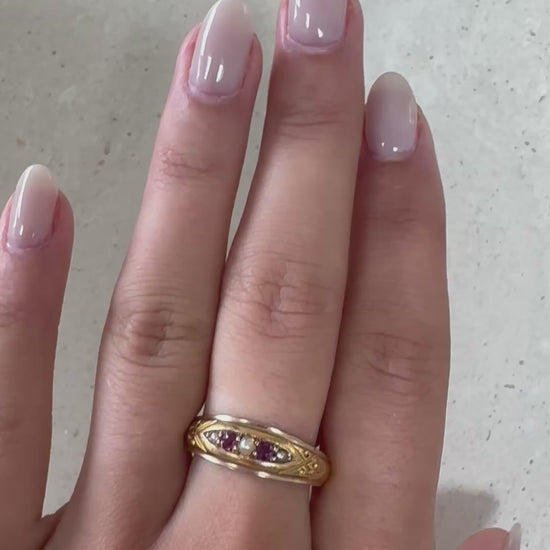 Ein seltener Edwardianischer Ring aus 15kt Gelbgold, gefertigt im Jahr 1908 in Birmingham. Besetzt mit leuchtenden Rubinen und zarten Saatperlen, vereint er Farbintensität mit feiner Eleganz. Das klassische Design und die historische Goldlegierung machen ihn zu einem besonderen Sammlerstück.