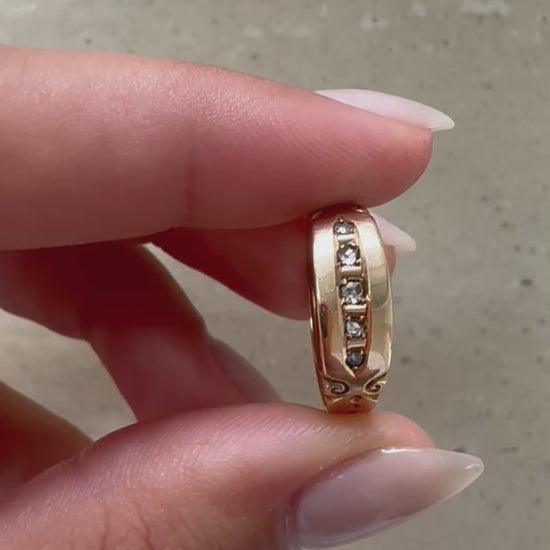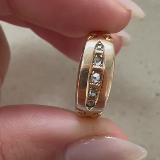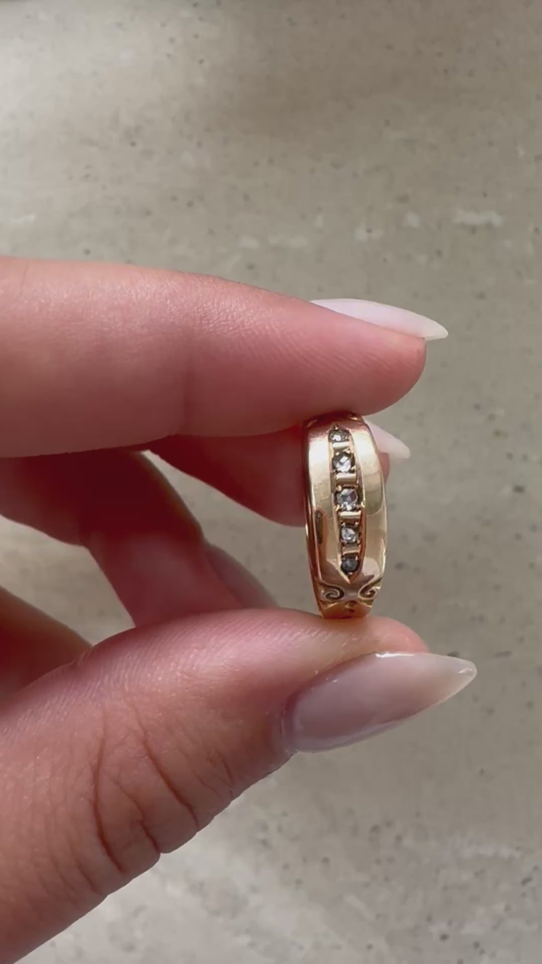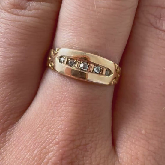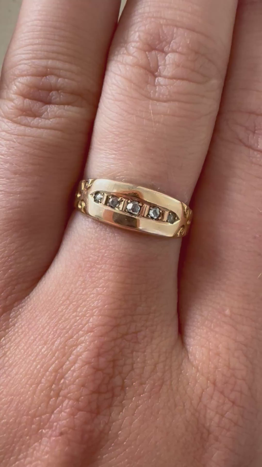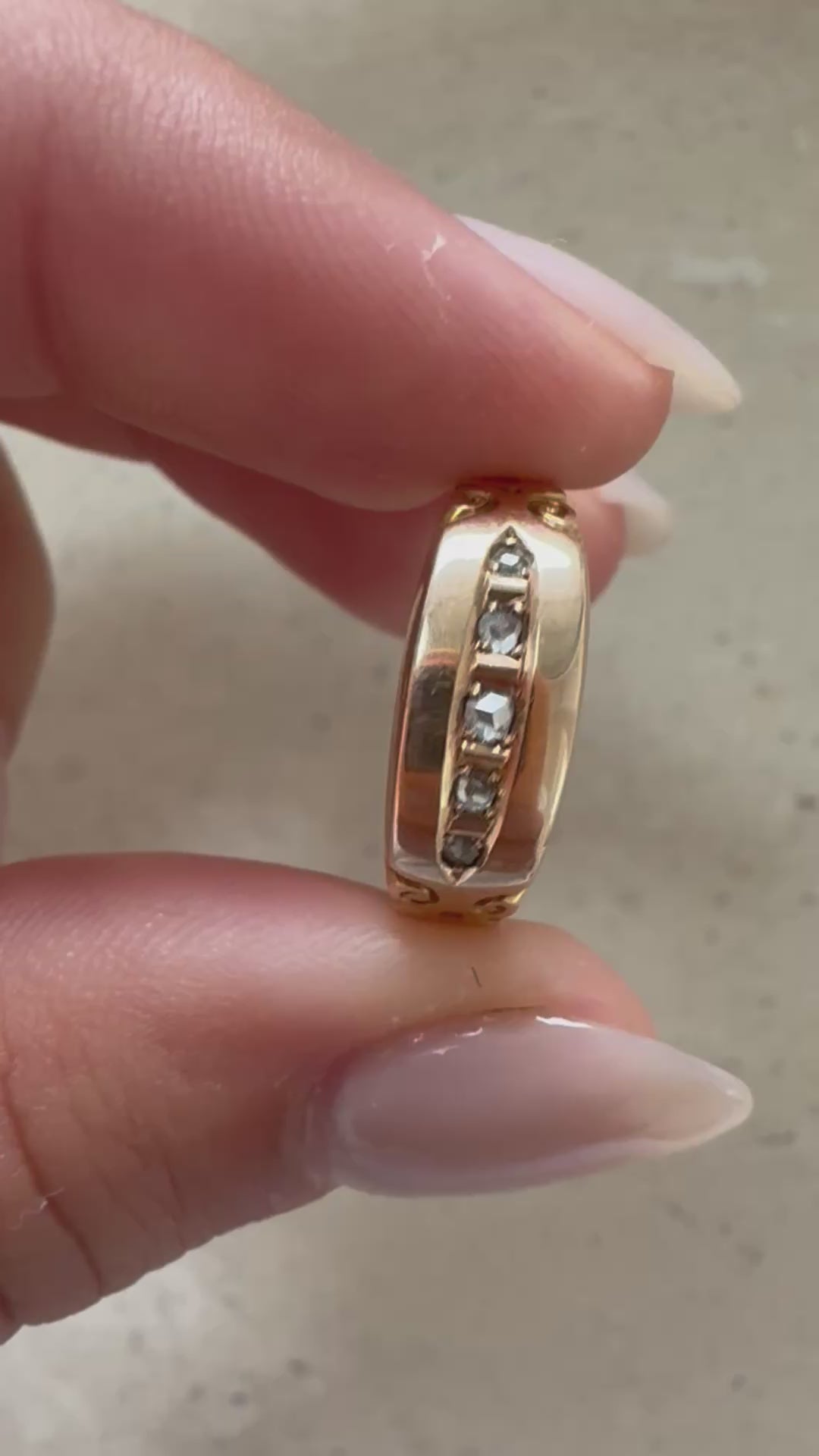 Ein aussergewöhnlicher Ring aus der späten Georgianischen Epoche – gefertigt 1805 aus warm schimmerndem 15kt Roségold. Die fünf funkelnden Diamanten in Rosenschliff sind in eine elegante, eingelassene Reihe gefasst, die von kunstvoll gravierten Schultern begleitet wird. Ein Stück mit über 200 Jahren Geschichte – kostbar, charaktervoll und absolut einzigartig. ✨