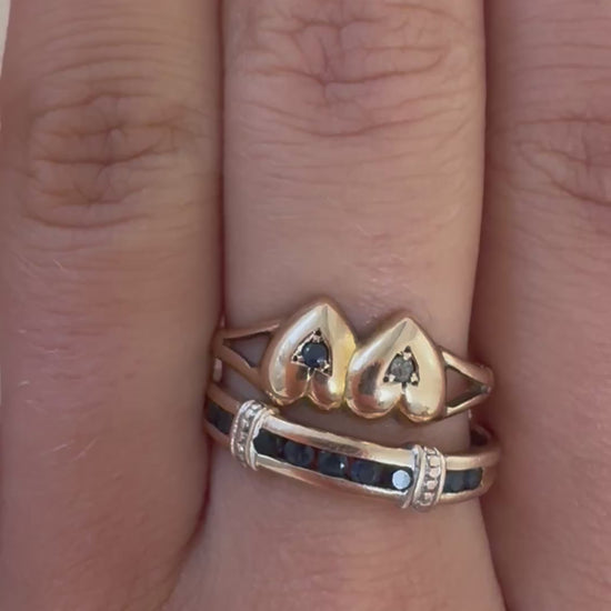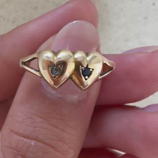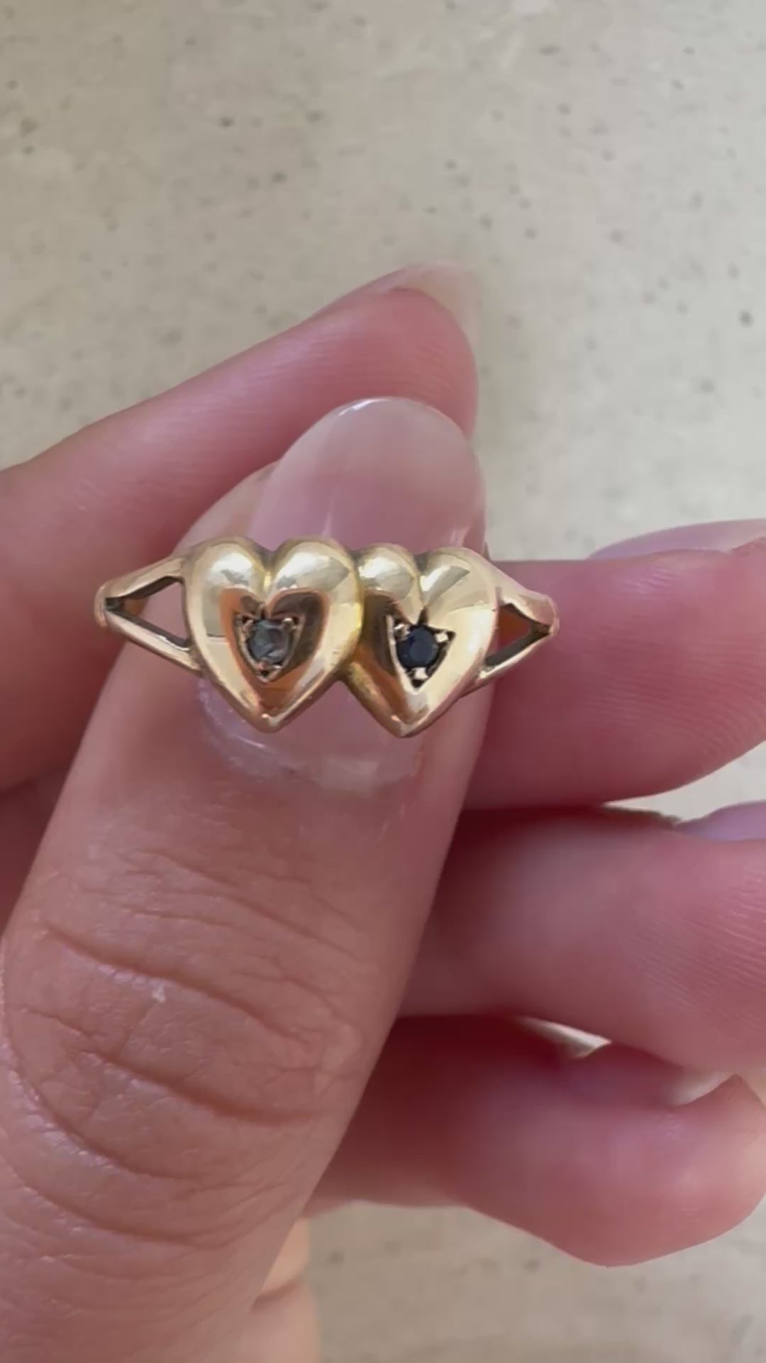 Ein seltener Schatz aus der viktorianischen Zeit – gefertigt im Jahr 1898 aus 15kt Gold und verziert mit zwei ineinander verschlungenen Herzen: eines besetzt mit einem Diamanten, das andere mit einem Saphir.
